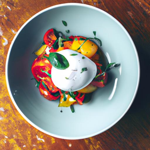 4. Riv burrataen i stykker og anret den ovenpå salaten.