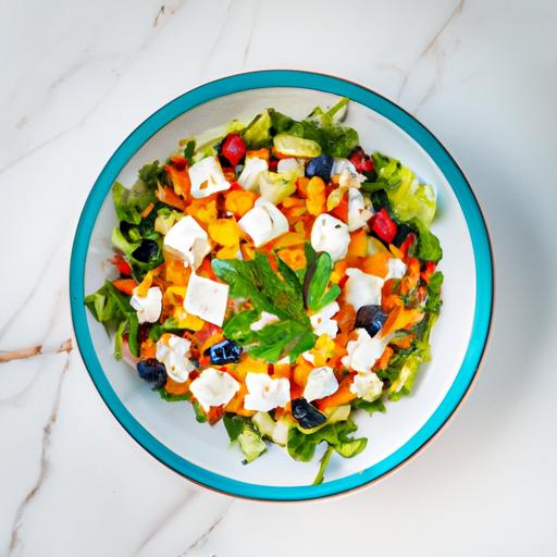 5. Bland olivenolie, citronsaft, salt og peber i en lille skål. Hæld dressingen over salaten og vend forsigtigt.