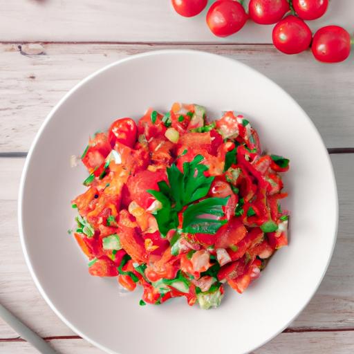 En lækker og sund salat med friske tomater og sprøde mungbønne-spirer. Forberedelsestid: 10 minutter