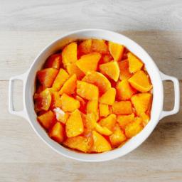 7. Når pannacottan er stivnet, skær små stykker af ananasen og fordel dem sammen med saften fra dåsen ovenpå pannacottaen.