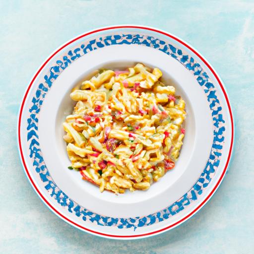 6. I en skål, bland pastaen, laksen, ærter, majs, peberfrugt og mayonnaise.
