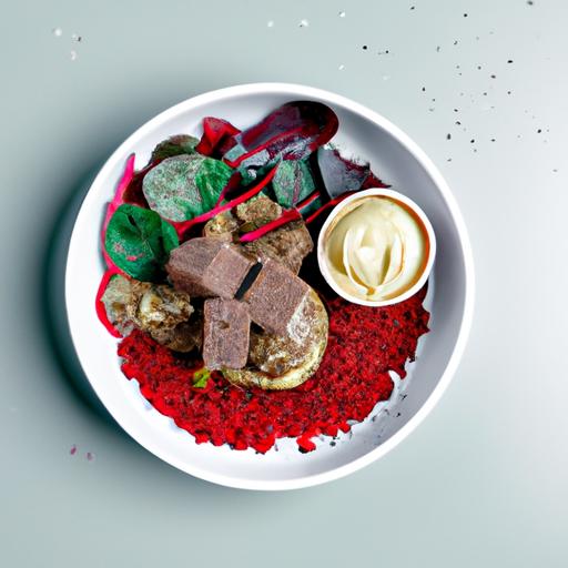 5. Anret de bagte kartofler på tallerkener, læg bøfferne ovenpå og hæld saucen over.