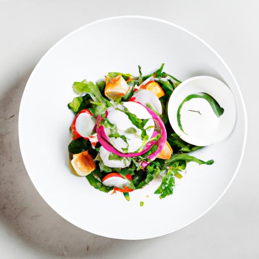 6. Bland olivenolie, balsamicoeddike, salt og sort peber i en lille skål og hæld dressingen over salaten.